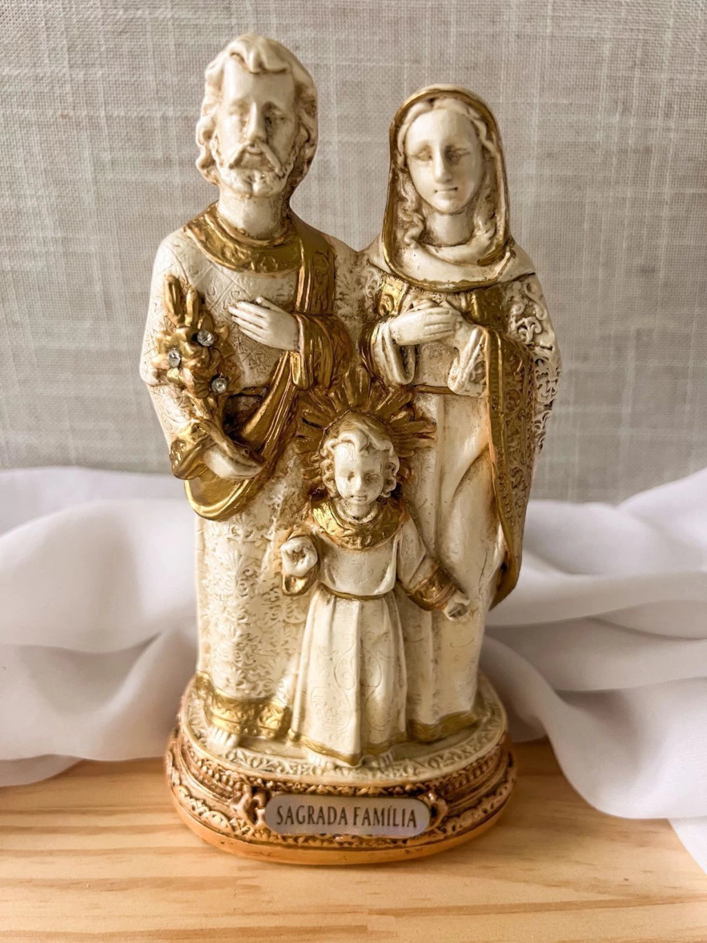 A Sagrada Família em gesso é uma peça delicada e cheia de significado, criada para trazer beleza, espiritualidade e proteção ao lar. Com acabamento detalhado e pintura em tons de dourado envelhecido, esta imagem destaca cada textura das vestes, feições serenas e ornamentos em relevo.